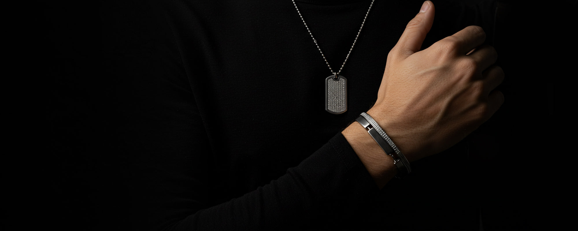 Men’s Stainless Steel Bar Pendant Necklace with Black Inlay & Crystal | Modern & Stylish