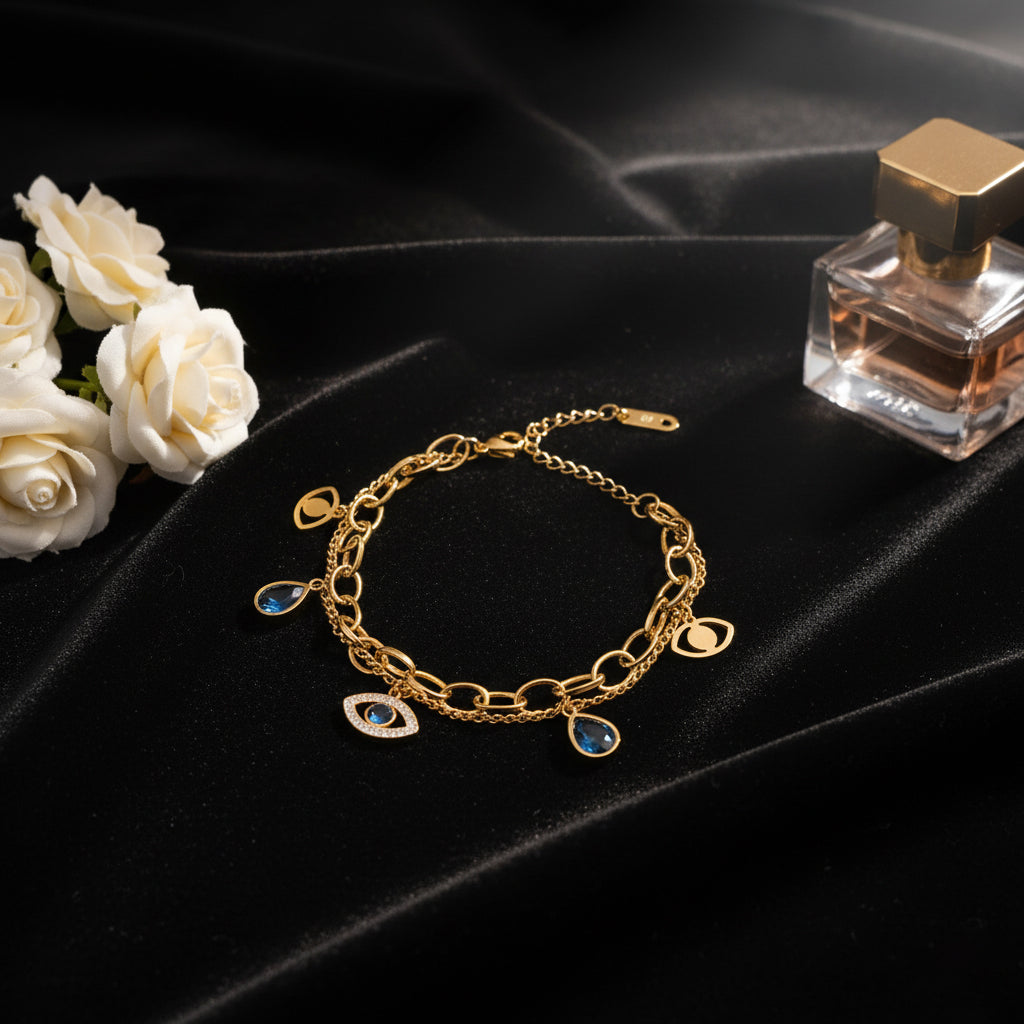 This stylish 18K gold-plated charm bracelet features sparkling blue tear-drop crystals and a premium Evil Eye charm designed for elegance and positivity. The double-layer chain link design adds a premium finish, making it perfect for both casual and festive outfits. Adjustable, durable and anti-tarnish—ideal for women and girls.