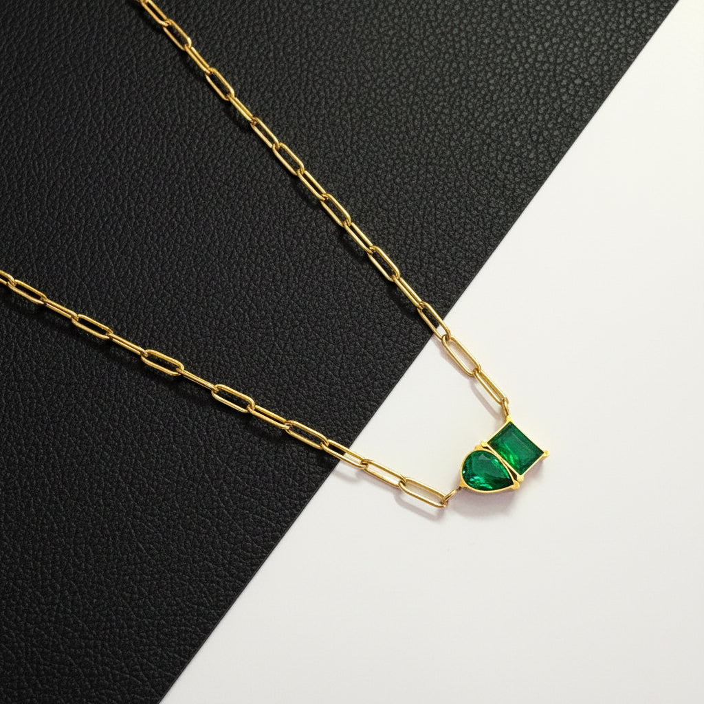 Elevate your style with this elegant 18K Gold Plated Green Stone Pendant Necklace, crafted with a modern link chain and dual-cut emerald green stones — one pear-shaped and one square-cut. The minimal yet luxurious design makes it perfect for daily wear, office styling, parties, or gifting.