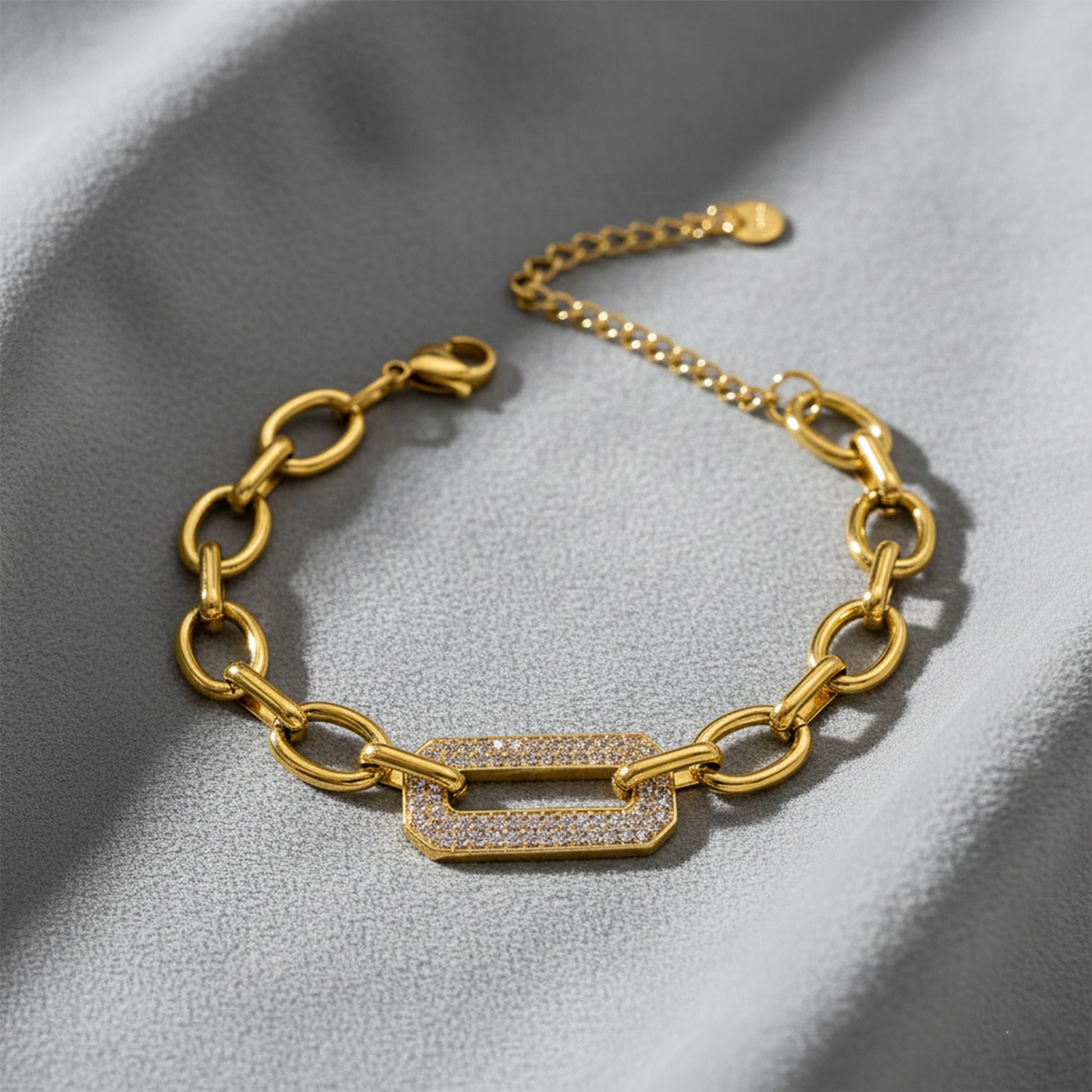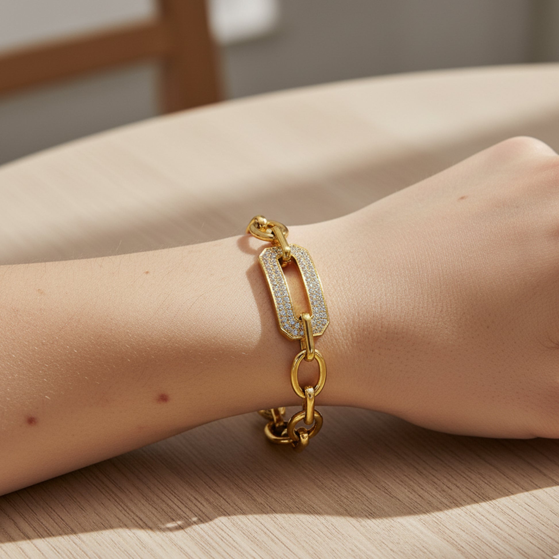 A chic and stylish 18K gold plated link bracelet featuring a shimmering crystal-studded rectangular charm. Perfect for everyday elegance, date nights, or layering with your favorite accessories. Adjustable, durable, and beautifully crafted to elevate your look effortlessly.