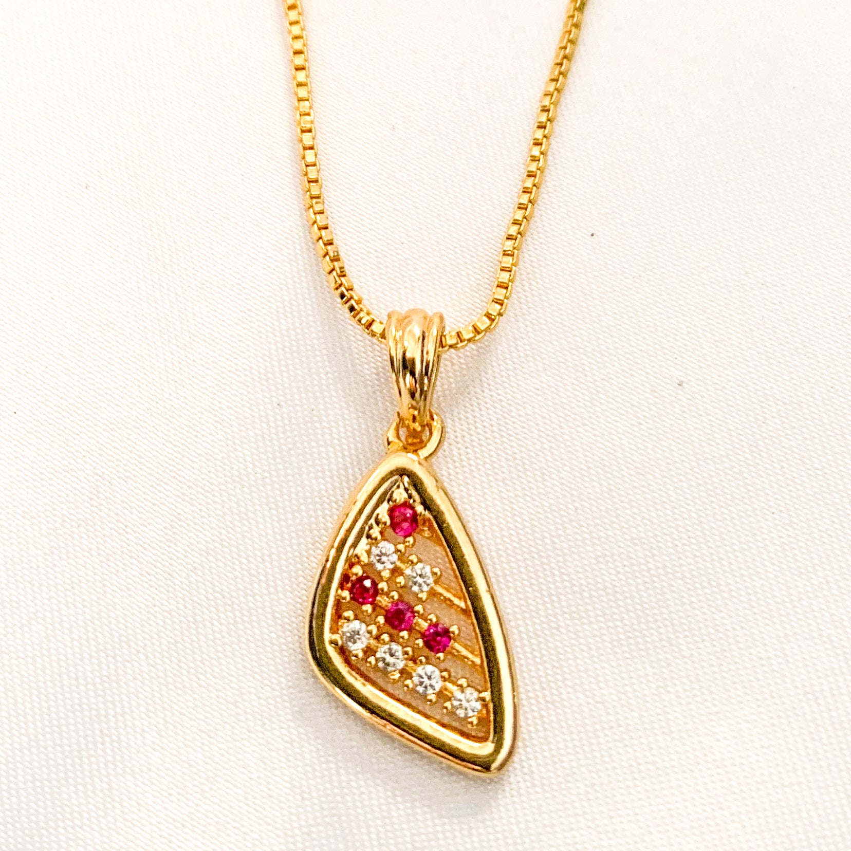 Gold-Plated Necklace with Triangular Red & White Stone Pendant