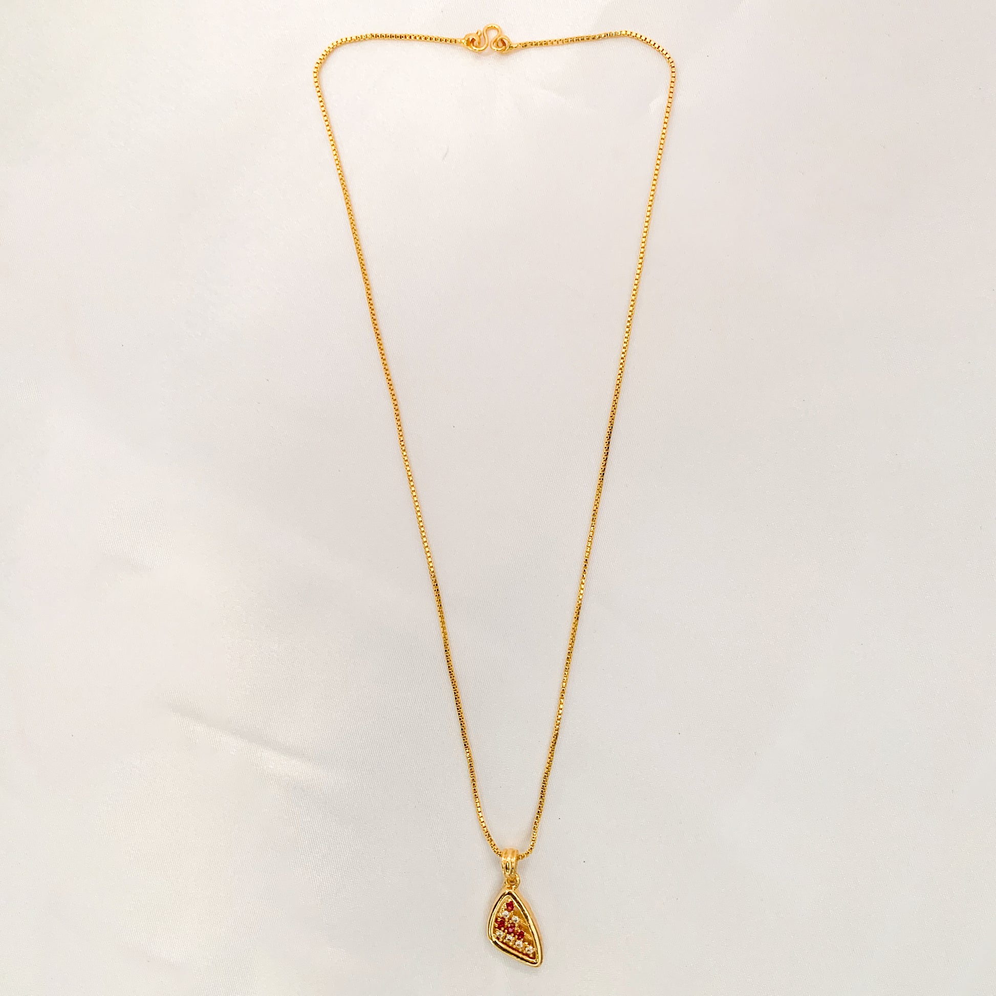 Add sparkle to your style with our Gold-Plated Necklace, featuring a chic triangular pendant set with shimmering red and white stones. Paired with a sleek box chain, this necklace is lightweight, skin-friendly, and versatile—perfect for both daily wear and festive occasions.